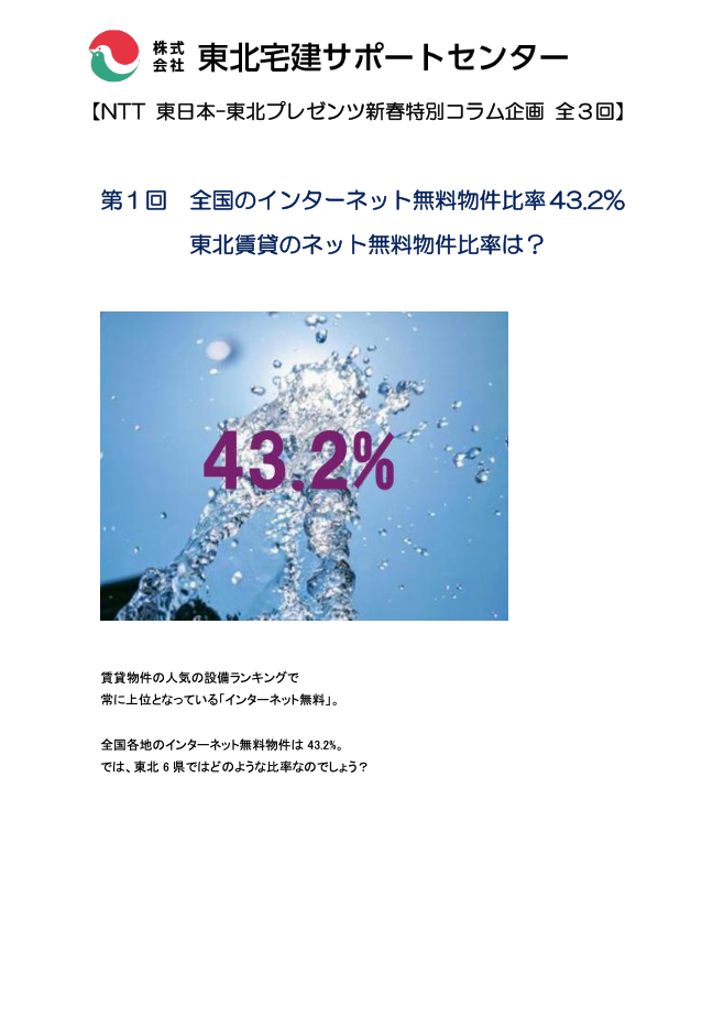 第1回「全国のインターネット無料物件比率43.2%東北賃貸のネット無料物件比率は?」